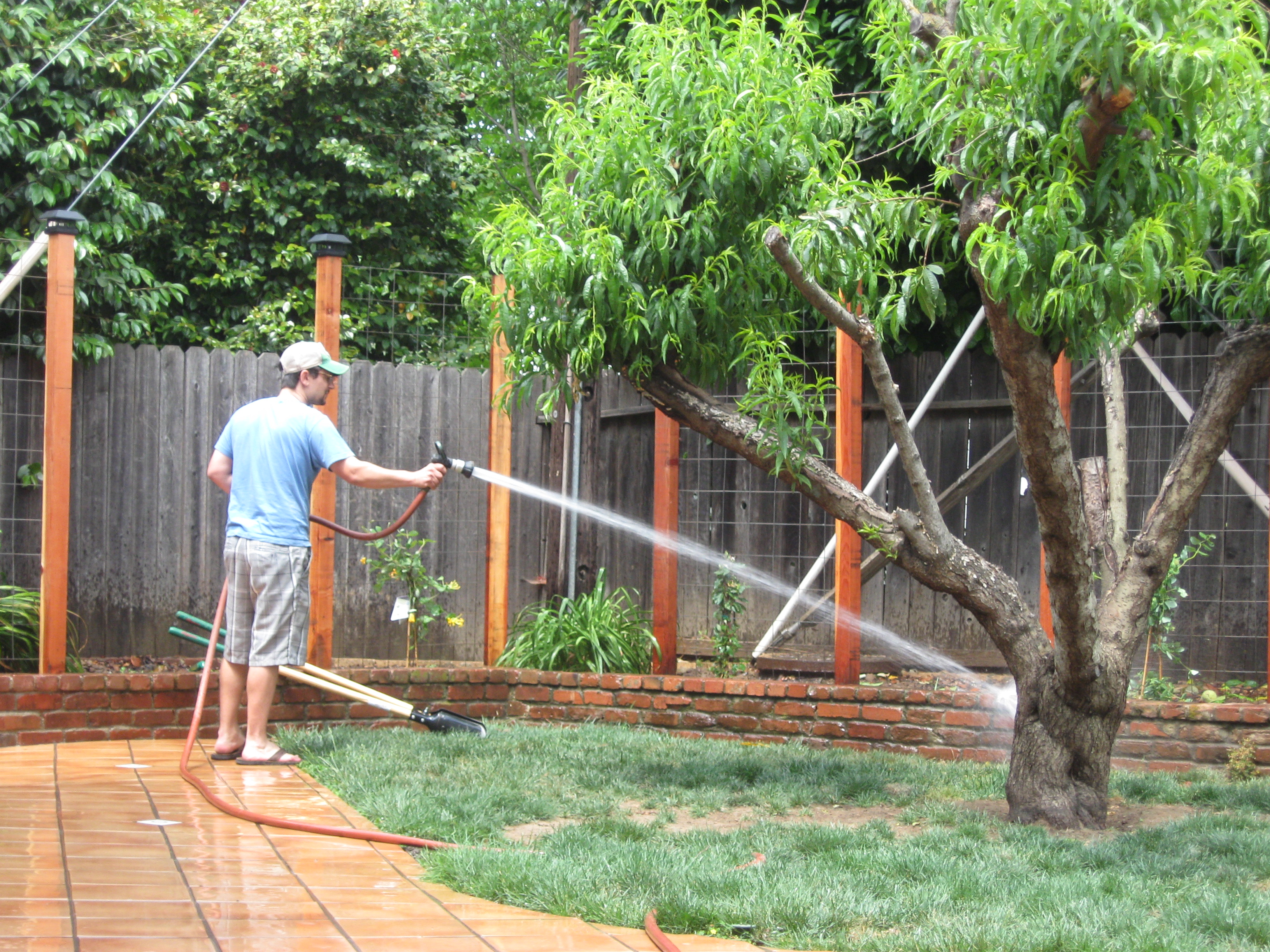 We placed the two trumpet vines in front of the outer screens (#1 and #5) since they are the hardiest and could probably take the most Sutter “marking” abuse. The honeysuckle were placed in the middle screens (#2, #3, #4) Be sure to break up the plant’s bottom roots a bit after removing it from the pot, place in hole and cover with soil. Finally give it a nice soak… Hubs gets a cameo because he was in charge of clean up and watering. (Once more ignore Stumpy the diseased tree and brown spots in the grass…all are on the project list)