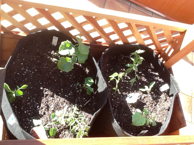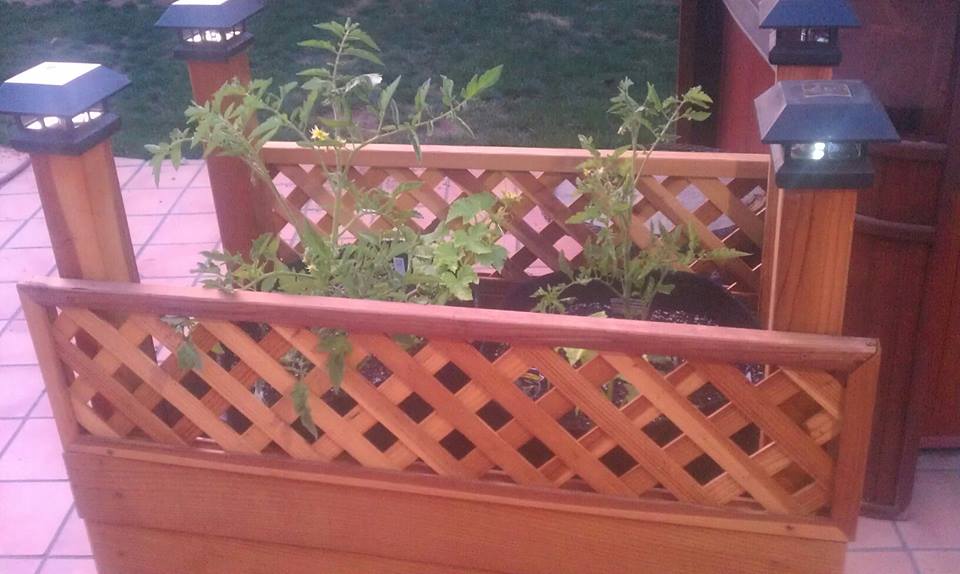 4. Add a few solar post lights for decoration, and using Geopots, we now have a rolling [dog proof] vegetable garden. Here are the tomatoes starting to spring up…