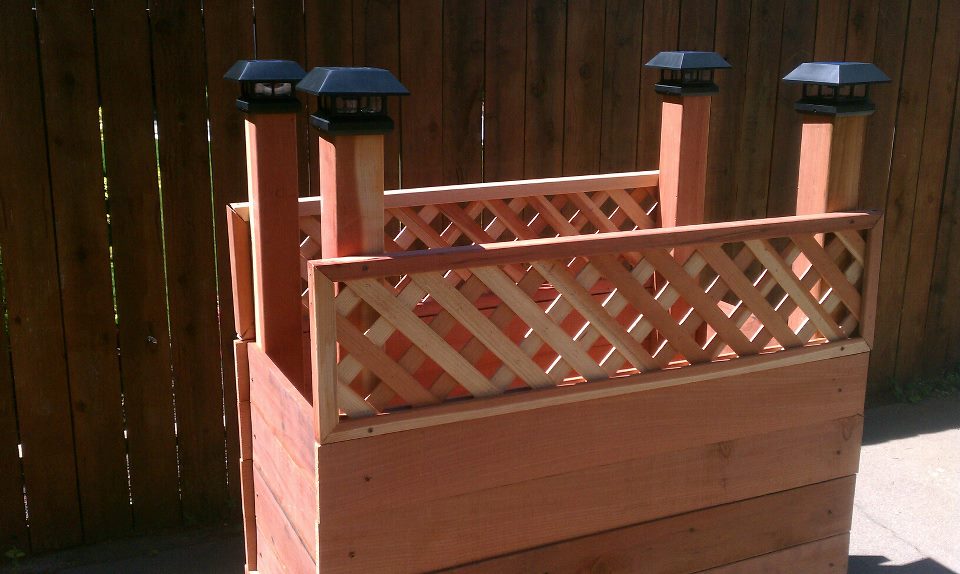 3. To add additional height and protection from hungry dogs we cut and added redwood lattice to two sides of the cart. Then we screwed heavy duty wheels with breaking mechanisms to the bottom of the 4 inch posts. As well as brace two 2inch x 4ft boards running parallel along the inside of the framed box. (see pictures below for a better visual) This would allow for heavy duty metal wire racks to lay on them. The pots of plants sat on top of these racks, since we needed to allow for proper drainage when watering the vegetables.