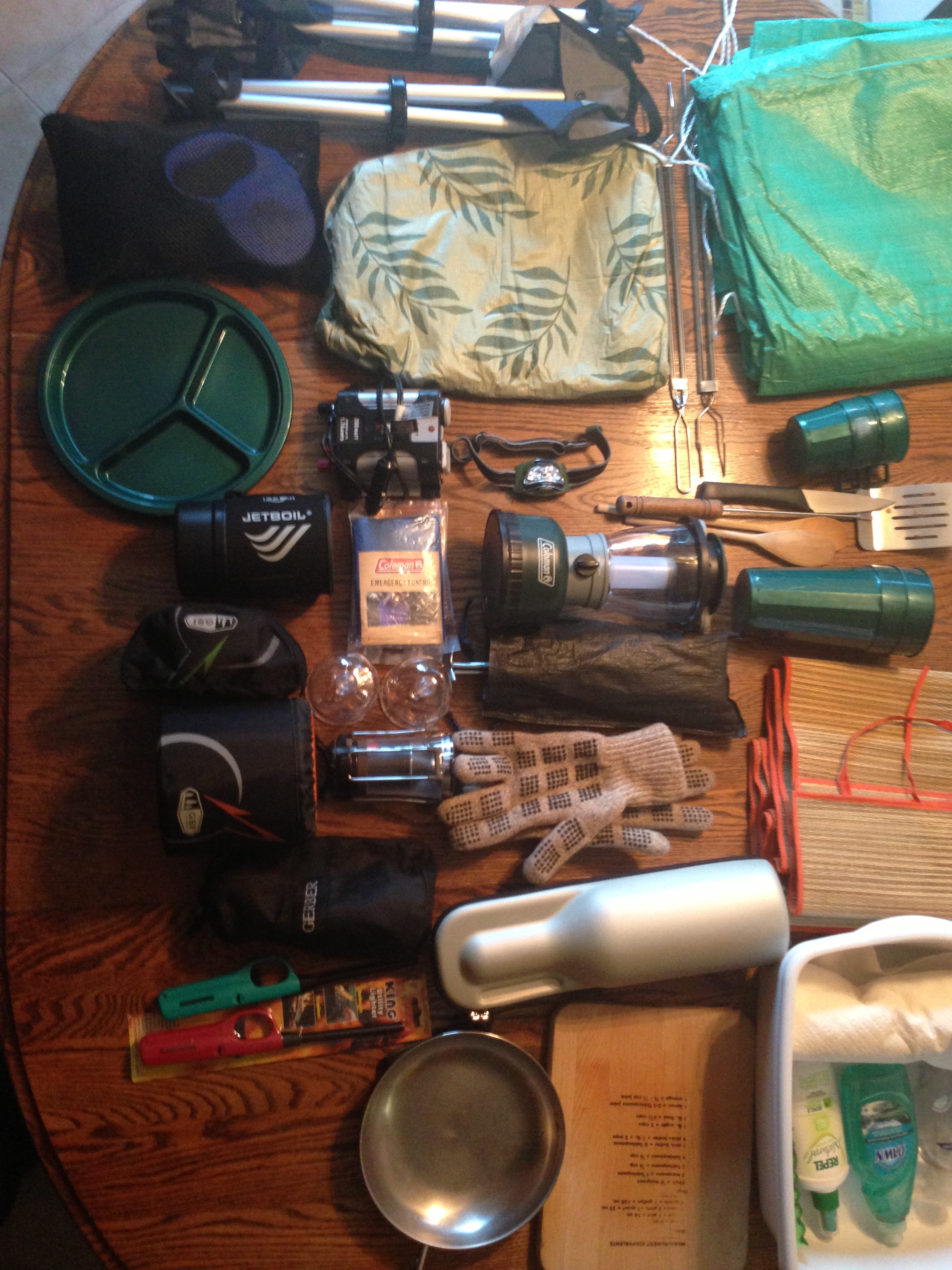 A great space saving camping tip is to take a back packers approach to cooking. We bring foods that don’t require a stove or ice chest, and can be boiled like spaghetti, and soups. (Which are fabulosuly inexpensive for the traveller on a budget) Also we use backpackers cooking utensils, such as the GSI kits, and Jet boil heating system, which allows us to ditch the big propane camp stove. If we want grilled or fried we use the campfire.