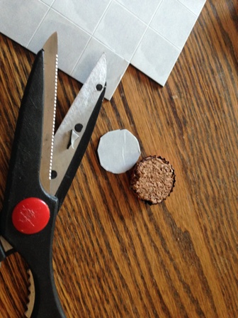 Next cut out the cork circles with scissors, add glue generously to the inside of the bottle cap and press the cork circle onto the glue. (Don’t worry about the cork not fitting just right, the cork crumbles and rips away easily enough so we were able to fit it to the cap)