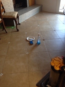 After we painted the fireplace gray and started priming away the mustard yellow walls, the tile was now the last piece of the ugly puzzle.