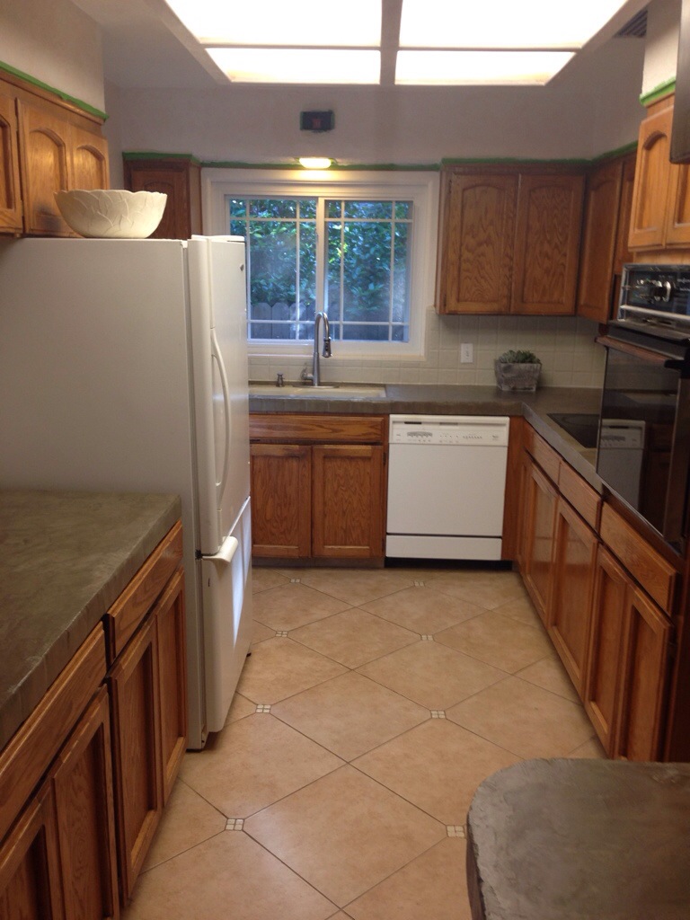 We allowed the paint to cure for another 48 hours. Then to give the transition of concrete countertops to tile backsplash a more finished look we used Dap’s waterproof silicone caulk in Biscuit to line the back edge. Of course, despite laying a line of painters tape I still made plenty of mistakes…