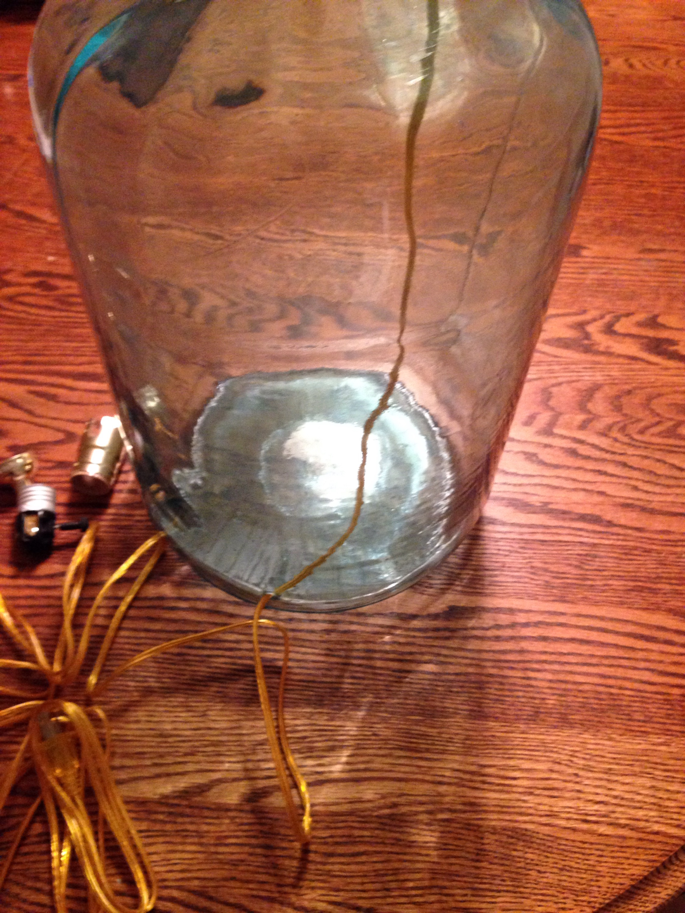 Luckily I already had an antique water bottle, picked up at the Sacramento antique fair for $5. Also a huge lamp shade sitting idle around the house (I think the shade was a Ross clearance for $6 since it has a small tear)