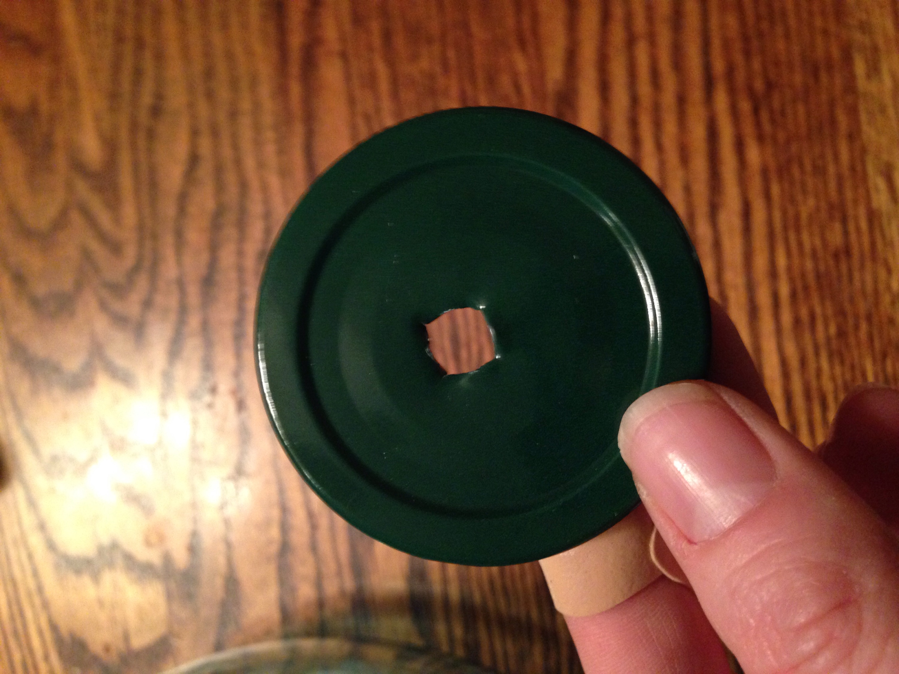 I found a relish lid that snapped onto the bottle opening perfectly, and punched a hole in the middle of it.