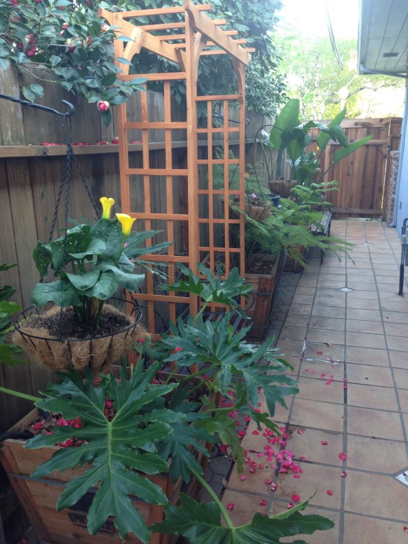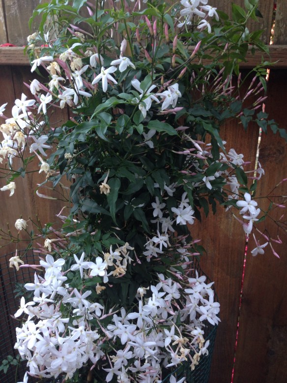 Although the jasmin was not planted in a basket (the papyrus died so we had an extra tall pot sitting vacant) We instead wrapped it with green chicken wire to keep the dogs out. Also the sideyard is shaded and sheltered enough for the lillies and begonias withstand the summer heat. To conserve water/moisture we’ll probably add mulch to all the pots and baskets.