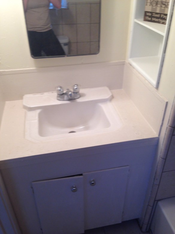All original from the previous owners and literally never touched by us. A nasty combo of grease coated, rusted out, painted over, sticky back linoleum, vinyl, wood and laminate surfaces. (Seriously I was two seconds away from calling our plumber and having both the bathroom sink and kitchenette torn out.) I thought the job impossible.