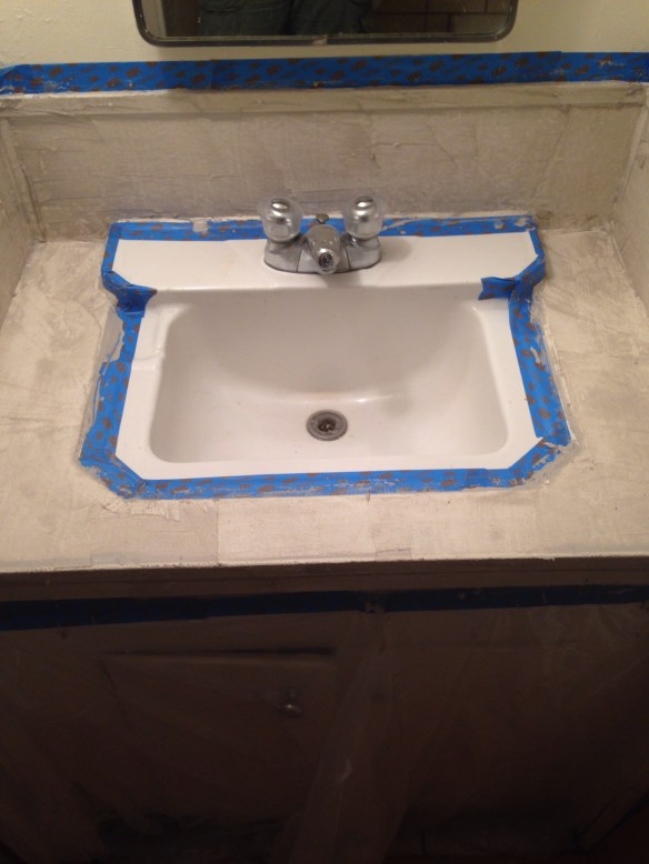 Like our last concrete project, Encore kitchen countertops, we knew to horde cardboard and stockpiling 3m painters tape. Next came repairing parts of the counter. (Ie re-gluing down peel and stick linoleum)