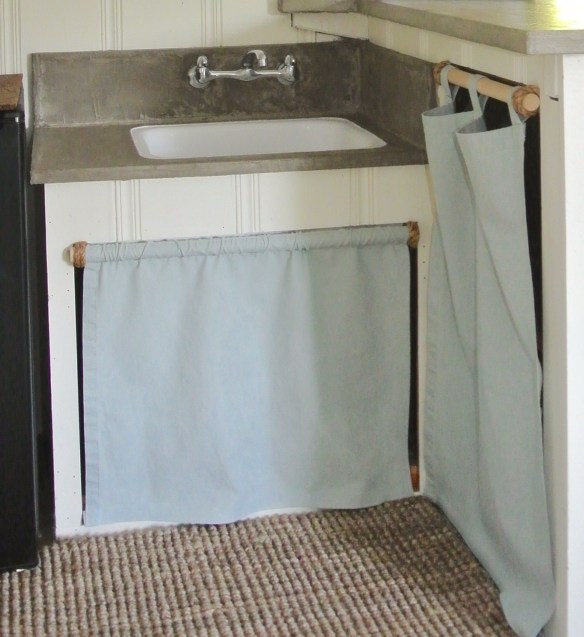 Basically the curtains slipped right on the dowels and we have no sew “cabinet skirts”.