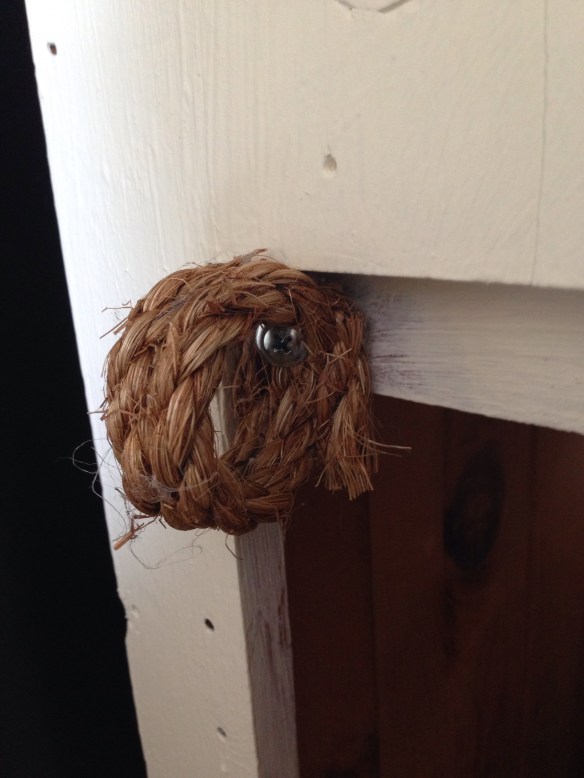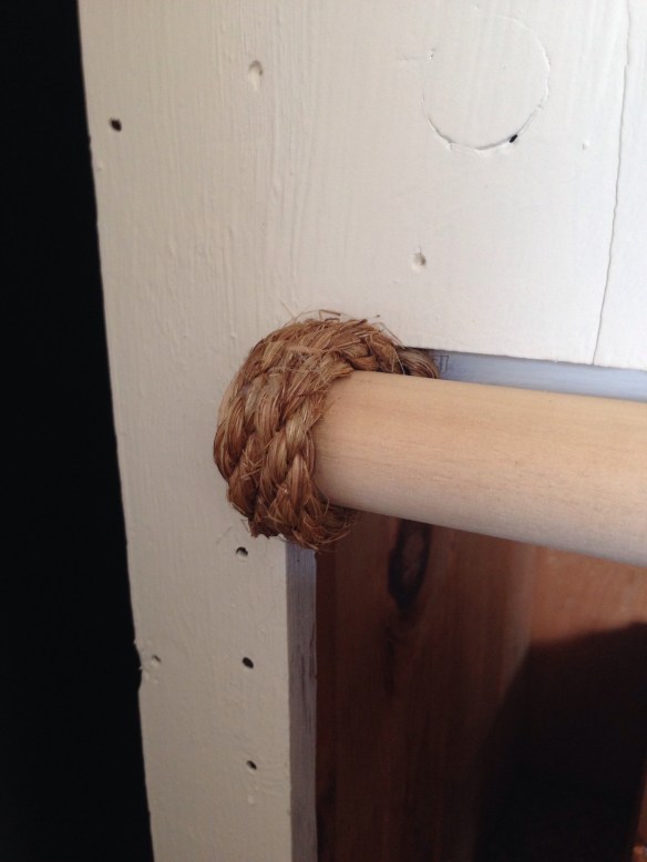We literally didn’t want to spend a cent on this project (especially after a recent splurge on accent pillows😉) Luckily we already had extra curtain panels from our oar curtain rods so a “no-sew vanity skirt” seemed to be a good idea (plus it would be free). With that in mind I rooted around the house for some kind of bracket or dowel to hang a vanity skirt. Dowels I found…Brackets I did not, but I found rope…