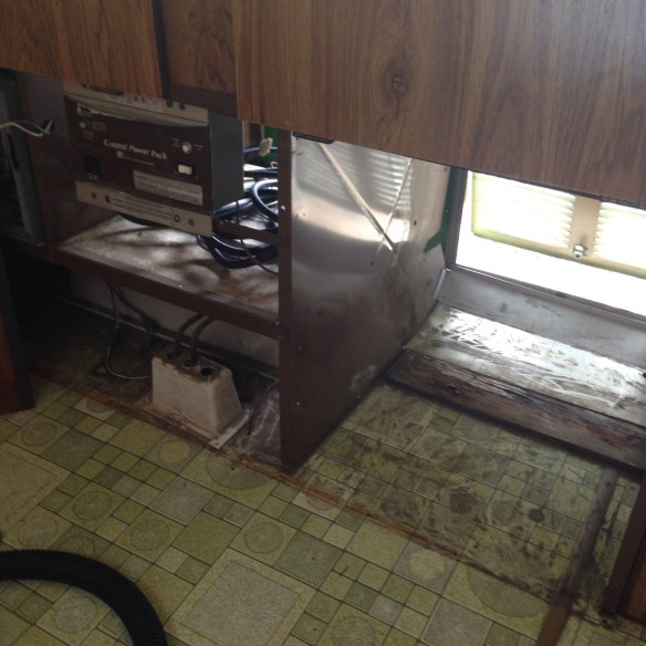 Yuck! Ugh!π Yeah that’s where the old 3-way refrigerator and water tank used to be. To get to these items you have to fold over the sink and counter, then unscrew the plywood cover (or in our case drill out many rivets.)