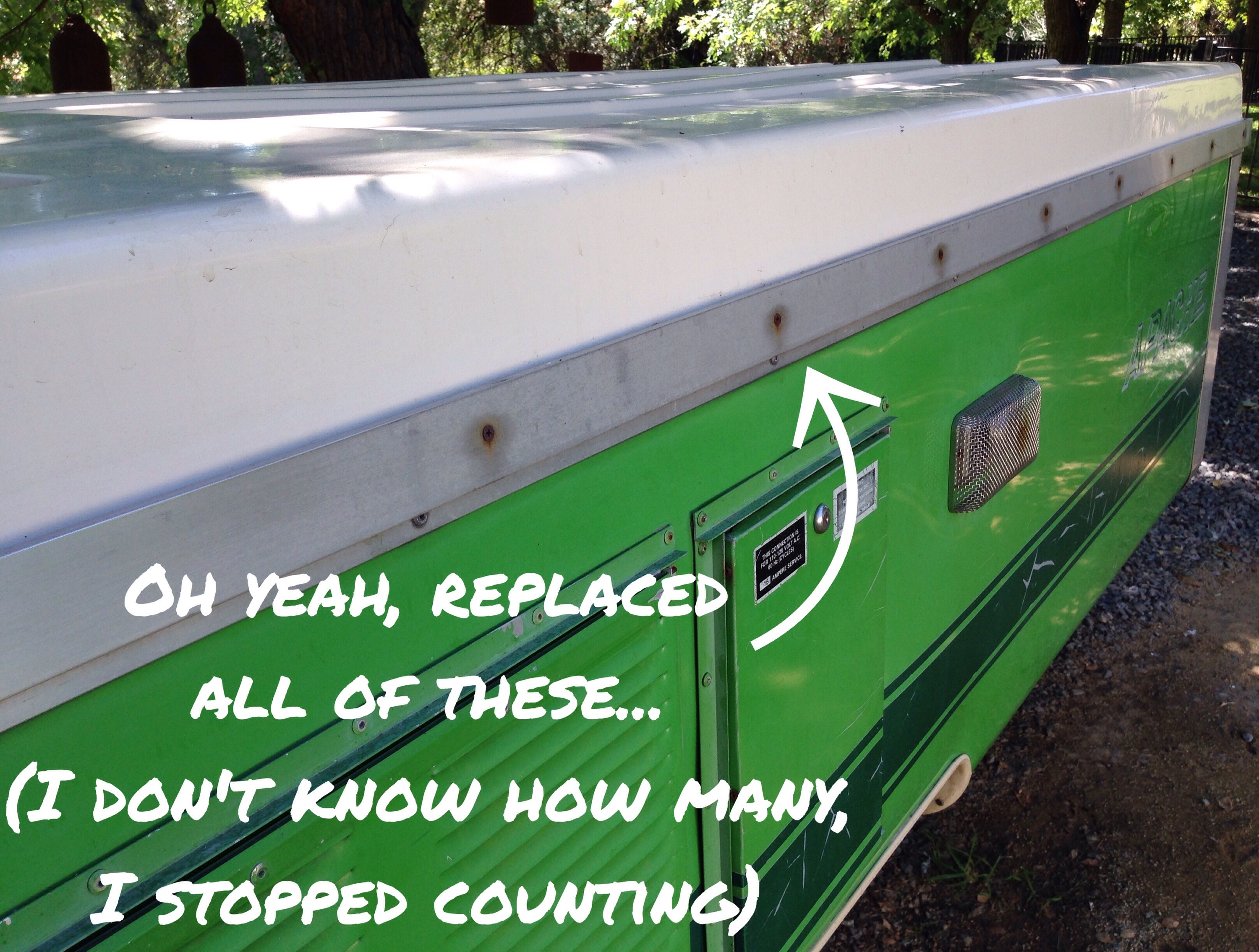 In the meantime we can’t wait to explore some more, which is why I kicked it into high gear on rehabbing our vintage Apache Pop up trailer yesterday. First up removing all the rusted out screws of the exterior and replacing them with stainless steel.
