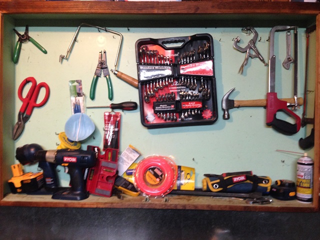 With the following materials/tools, we only used the front of the drawers and extra slats to drill and glue them to the front of the day bed. (The staples and staple gun were for upholstering the bench seat)