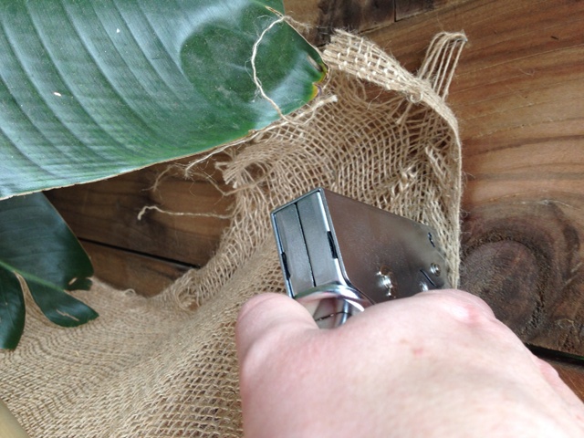 Next wrap your plant with the burlap and attach it to the bamboo stakes using the staple gun or even stapling it to the adjacent fence if necessary.