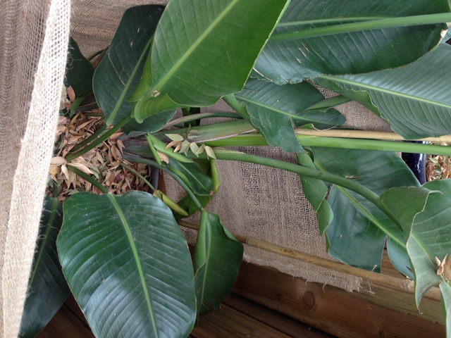 Now if you have a real hard frost, use any excess burlap to cover the tops of the plants at night, and just remove the covers during the day so they can still get some winter sun, rain and/or if the day warms up. They also suggested to give the plants a good watering during the warmest part of the day at least twice a week during dry, cold stretches. (Making sure the water is penetrating the root system.) This may not be the prettiest idea, but it should protect our tropical plants. We’ll free the “girls” in the spring and see if this technique actually worked!